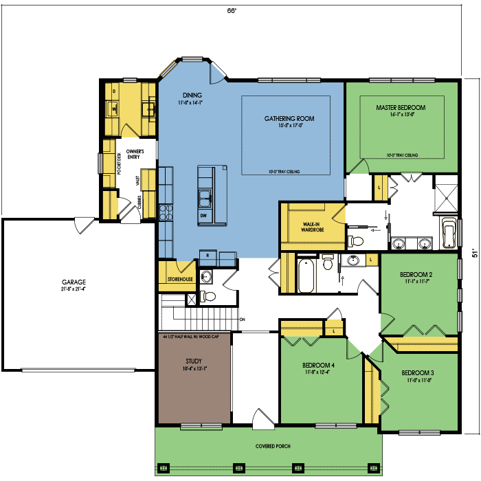 A part of our Family Series, the Crater Lake floor plan features 4 bedrooms and 2.5 bathrooms with a footprint of 66x54 feet and 2399 total square feet of living space. Floor Plan #FM150
