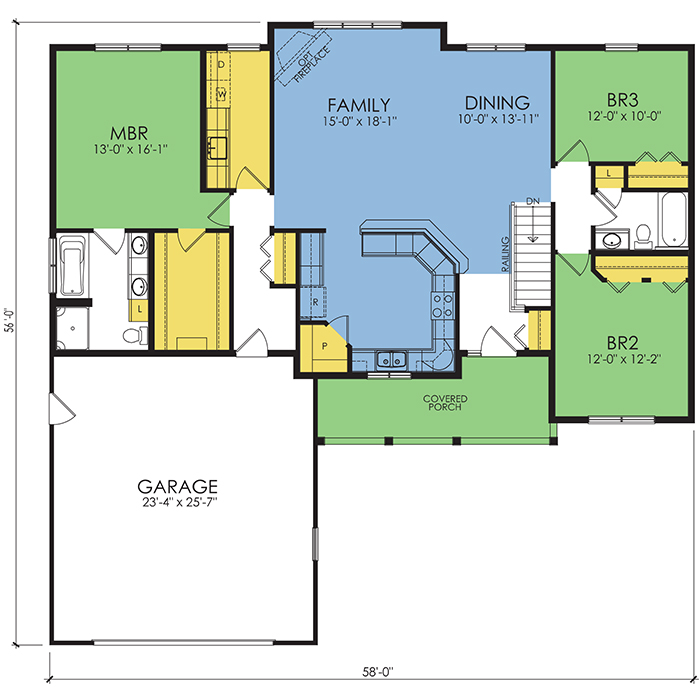 A part of our Wausau Originals, the Dalton floor plan features 3 bedrooms and 2 bathrooms with a foot print of 58x56 feet and 1764 total square feet of living space. Floor Plan #WO402