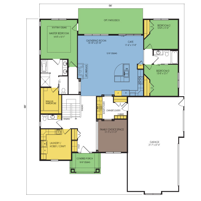 A part of our Designer Series, the Medina floor plan features 3 bedrooms and 2.5 bathrooms with a foot print of 56x68 feet and 2268 total square feet of living space. Floor Plan #DT109