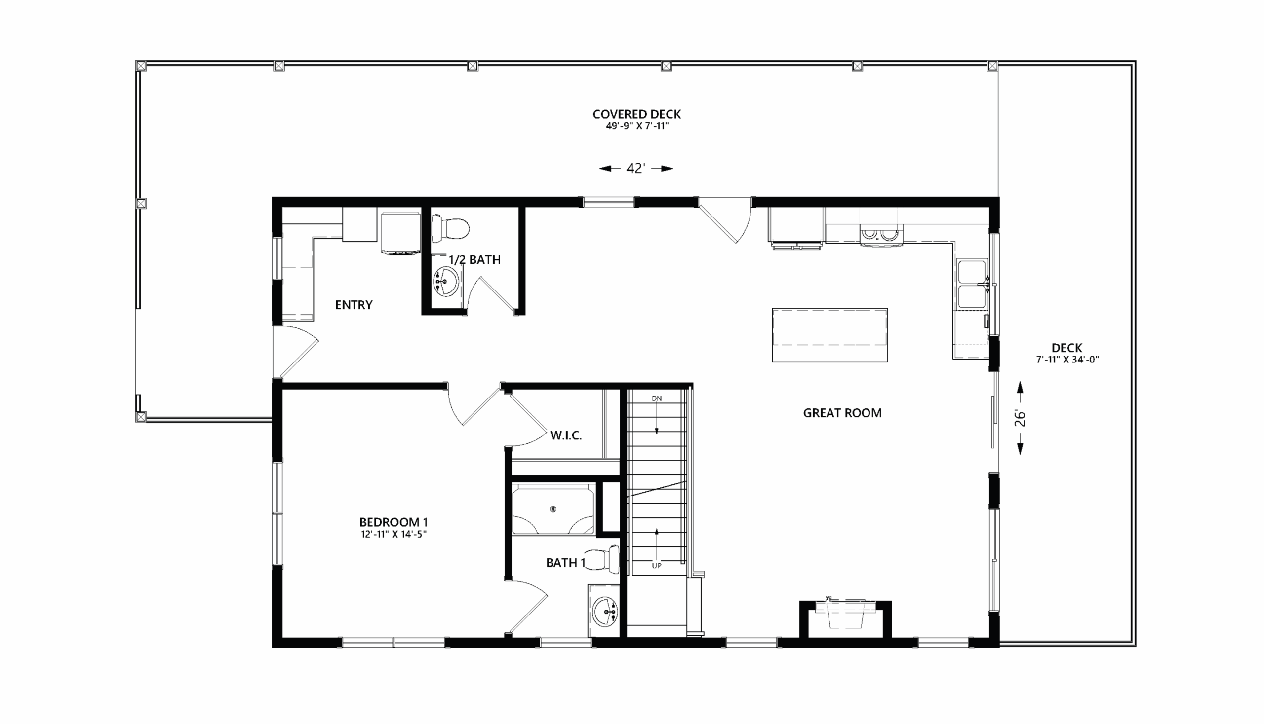 The great room includes a fireplace and flows into the kitchen and dining area, with sliding doors that open to the back deck. Along the front and side, a wraparound covered deck extends the home’s outdoor living space, connecting directly to the open back deck for a seamless indoor–outdoor experience. The main level also includes a private primary suite and an owner's entry that transitions directly into the laundry room for everyday convenience.