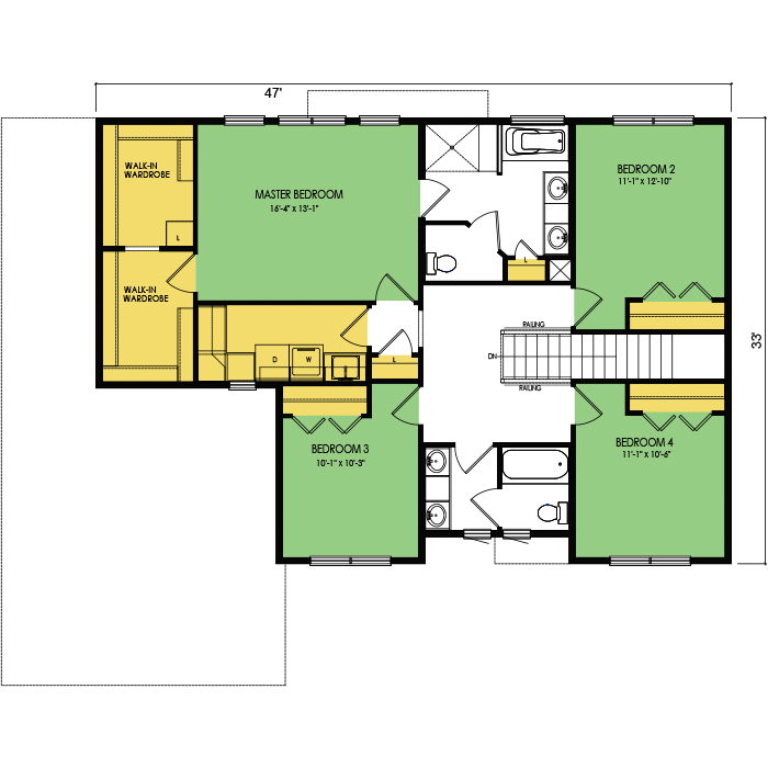 A part of our Family Series, the Yellowstone 2-story floor plan features 4 bedrooms and 2.5 bathrooms, a 2 car garage, a footprint of 54x44 feet, and 2527 total square feet of living space. Floor Plan #FM244